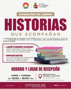 Cancún.- Las palabras también pueden ser libertad y bajo esta premisa, el Instituto de la Cultura y las Artes de Cancún lanza la convocatoria “Historias que acompañan”, una noble iniciativa que invita a la comunidad a donar libros para crear y enriquecer la Biblioteca del Centro de Reinserción Social de Benito Juárez.