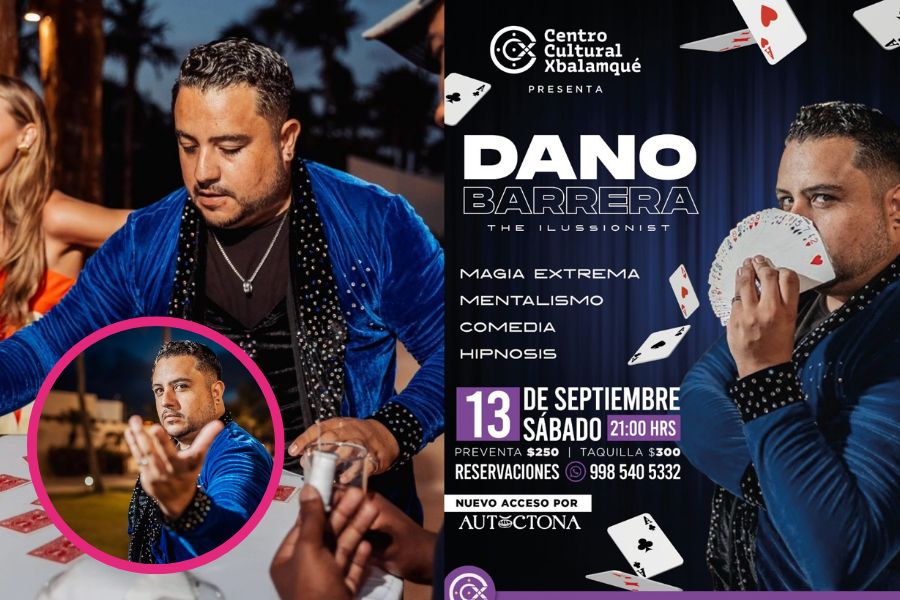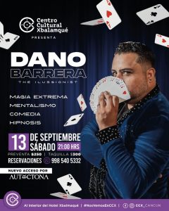 Este sábado 13 de septiembre, el escenario del CCX, ubicado en el interior del Hotel Xbalamqué, abrirá sus puertas a un espectáculo único encabezado por Dano Barrera, The Illusionist, un artista que mezcla magia extrema, mentalismo, comedia e hipnosis en una propuesta que promete dejar sin aliento a quienes se atrevan a mirar de cerca.