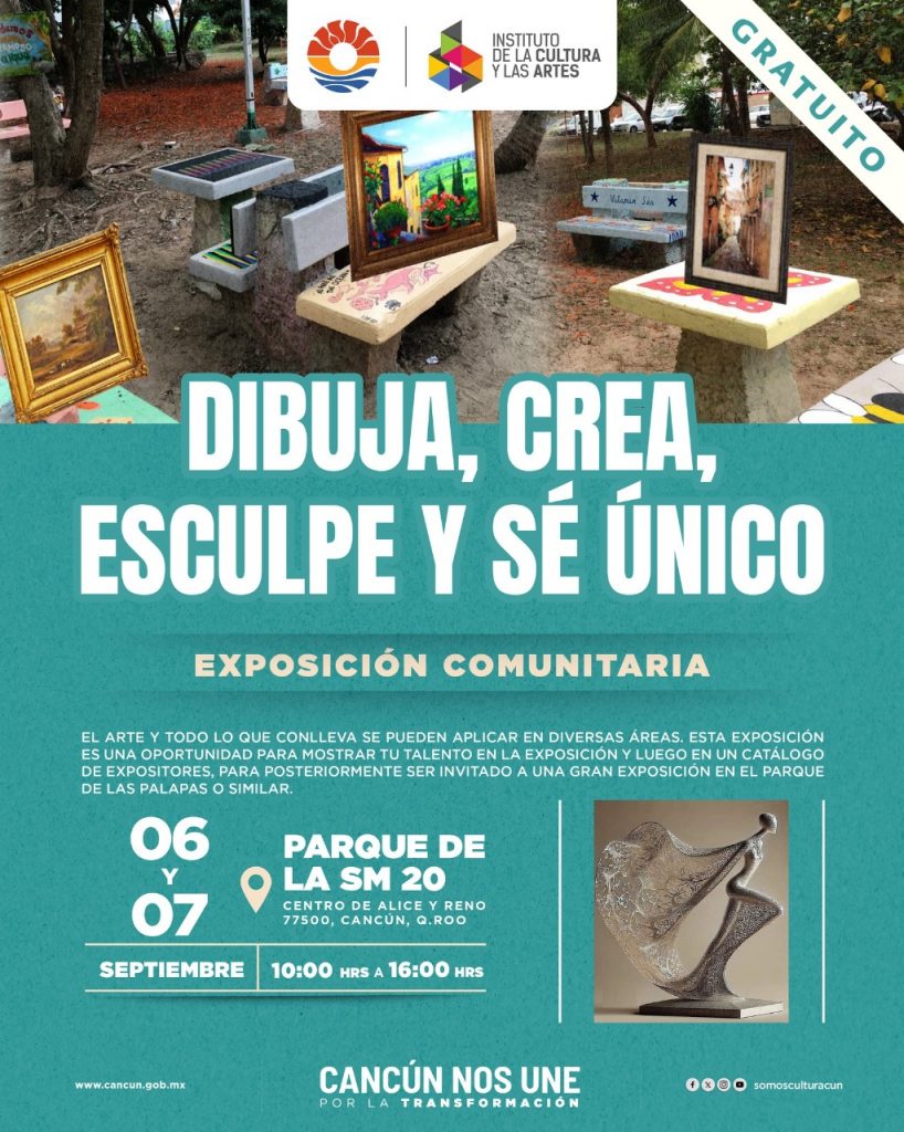 La cita será el 6 y 7 de septiembre, en el Parque de la Supermanzana 20, de 10:00 a 16:00 horas, donde los participantes no solo tendrán la posibilidad de compartir su talento, sino también de integrarse a un catálogo de expositores y acceder a la oportunidad de presentar sus obras en una magna exposición en el Parque de las Palapas, corazón cultural de la ciudad.