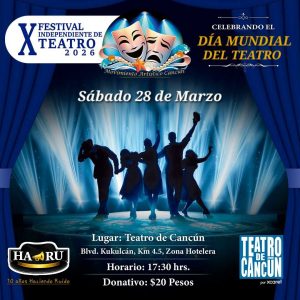 La celebración se llevará a cabo el sábado 28 de marzo en el Teatro de Cancún, espacio donde el público podrá disfrutar de una muestra diversa del talento escénico local a través de fragmentos de montajes teatrales que reflejan la riqueza y variedad de propuestas surgidas desde la escena independiente.