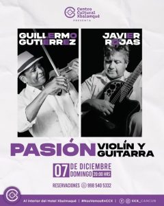 Cancún.- En una atmósfera creada para estremecer los sentidos, el violín de Guillermo Gutiérrez y la guitarra de Javier Rojas se darán cita en el Centro Cultural Xbalamqué para ofrecer un concierto que promete encender el alma del público.