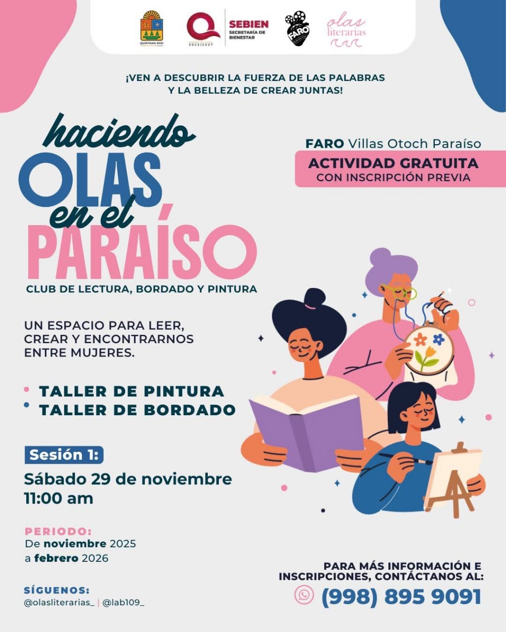 Cancún.- Entre páginas, hilos y colores, un nuevo espacio creativo comienza a abrir paso para las mujeres de la ciudad. Se trata de ‘Haciendo olas en el paraíso’, una propuesta cultural que invita a reunirse, conversar y transformar la lectura en formas de expresión artística que nacen desde la intimidad y la imaginación.