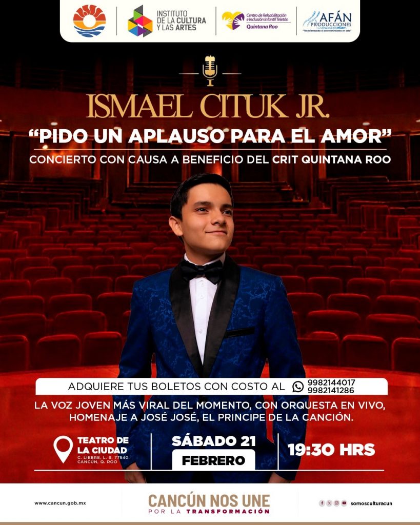 Cancún.- Este sábado 21 de febrero, el Teatro de la Ciudad será escenario de “Pido un aplauso para el amor”, el concierto debut del cantante cancunense Ismael Cituk Jr.