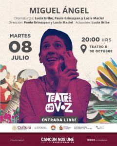 Cancún.- El escenario del Teatro 8 de Octubre será testigo de una propuesta teatral audaz, irreverente y profundamente humana: “Miguel Ángel”, un monólogo escrito e interpretado por Lucía Uribe, que forma parte del Festival de Monólogos Teatro a Una Sola Voz.