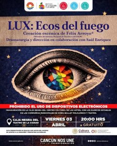 Cancún.- Desconectarse de cualquier dispositivo digital durante 50 minutos para conectar los sentidos con “LUX: Ecos del Fuego”, espectáculo multidisciplinario de Félix Arroyo, se convierte en una experiencia de otro nivel.