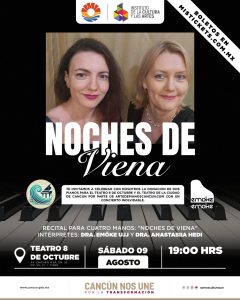 Cancún,-El próximo sábado 9 de agosto, el Teatro 8 de octubre se vestirá de gala para recibir una noche inolvidable: el recital para piano a cuatro manos “Noches de Viena”, protagonizado por dos reconocidas intérpretes, la Dra. Emöke Ujj y la Dra. Anastasiia Hedi, quienes deleitarán al público con un repertorio lleno de elegancia, sensibilidad y virtuosismo.