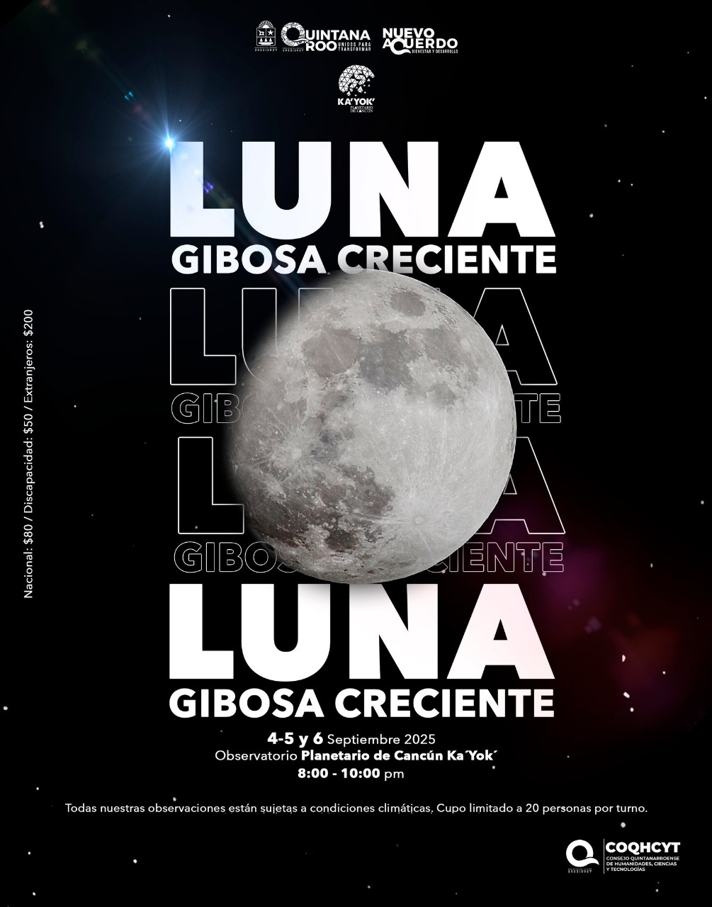 La cita es este sábado 6 de septiembre, de 8:00 a 10:00 de la noche, donde el público podrá maravillarse con la Luna en su fase Gibosa Creciente, una etapa en la que su superficie brilla con intensidad y deja al descubierto sus relieves más fascinantes.