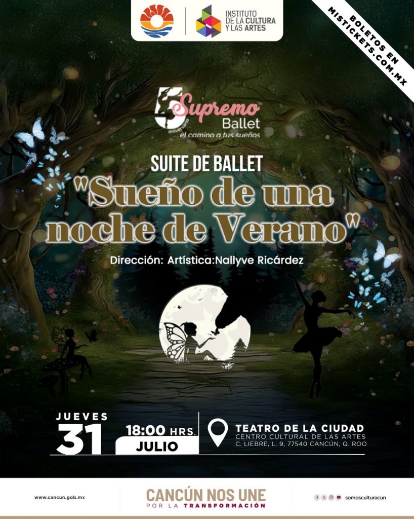 Cultura.- La elegancia del ballet clásico y la fantasía del teatro se unen en una experiencia mágica con la puesta en escena de Sueño de una noche de verano, a cargo de la escuela Supremo Ballet, que se presentará este jueves 31 de julio a las 18:00 horas en el Teatro de la Ciudad de Cancún.