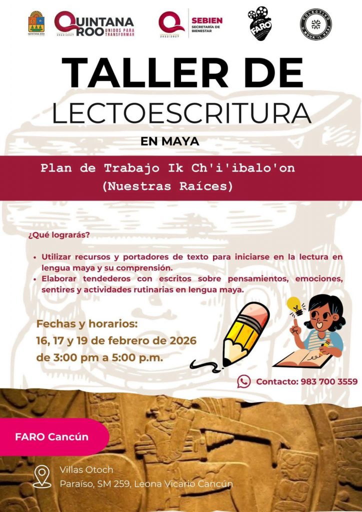Taller de Lectoescritura en Maya 16, 17 y 19 de Febrero 2026 Cupo limitado (15 personas) 03:00 pm a 05:00 pm