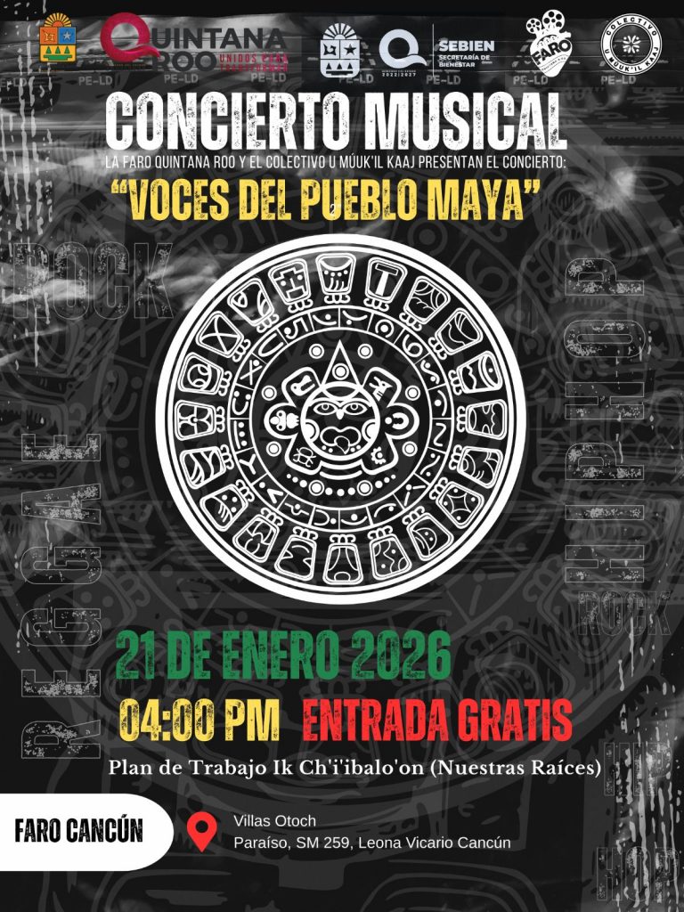 Como parte del Plan de Trabajo “Ik Ch’i’ibalo’on “(Nuestras Raíces)” beneficiado por el Programa FARO del Bienestar, Modalidad: Fortalecimiento de los Agentes Culturales Comunitarios 2025 (FORACC 2025), el Colectivo U Múuk’il Kaaj, con el liderazgo de la Lic. Natividad Ballado Poot, implementará talleres y conciertos en la Fábrica de Artes y Oficios (FARO) en Cancún y Chetumal.
