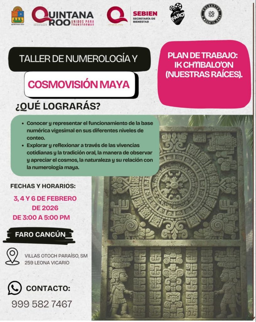 Taller de Numerología y Cosmovisión Maya. 03, 04 y 06 de febrero 2026 Cupo limitado (15 personas) 03:00 pm a 05:00 pm
