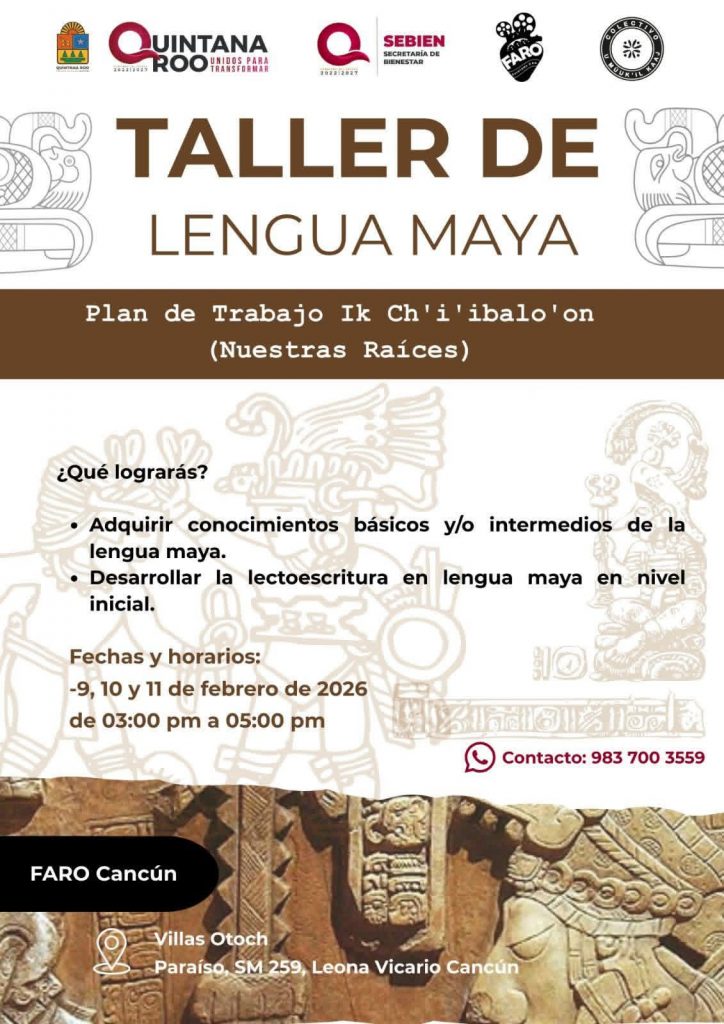 Taller de Lengua Maya 09 al 11 de febrero 2026 Cupo limitado (15 personas) 03:00 pm a 05:00 pm