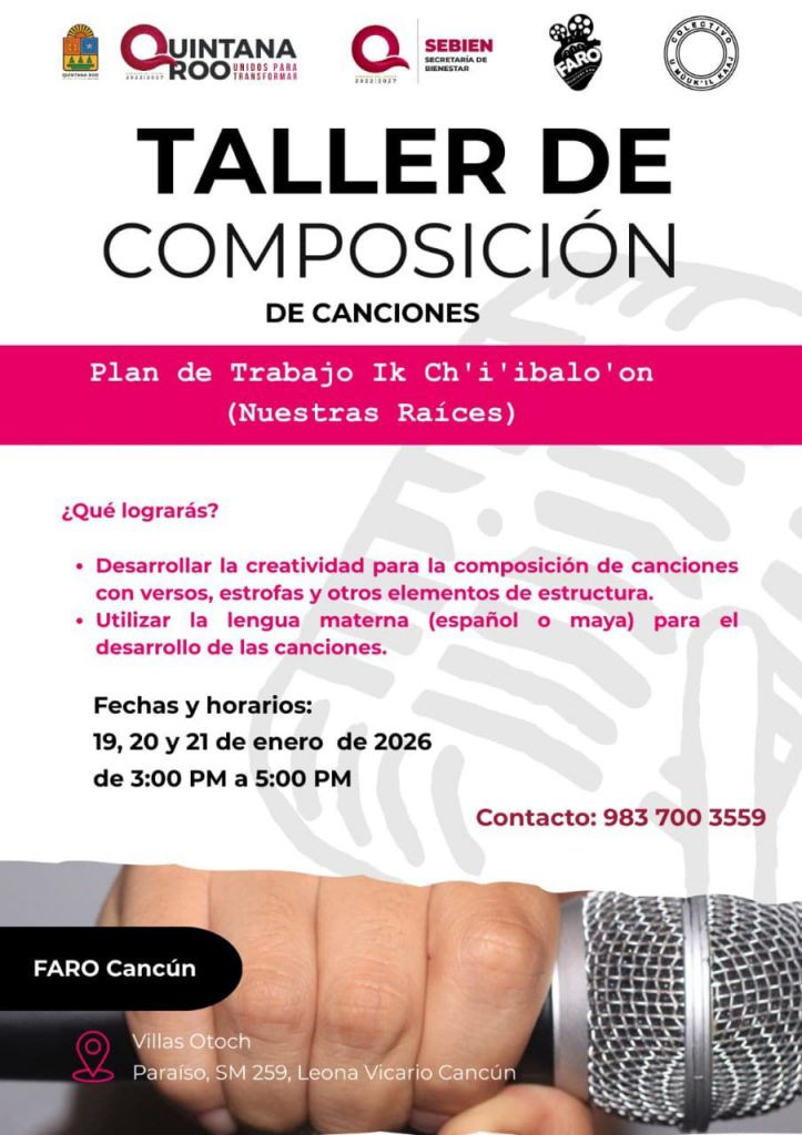 Taller de Composición de Canciones. 19 al 21 de enero 2026 Cupo limitado (15 personas) 03:00 pm a 05:00 pm