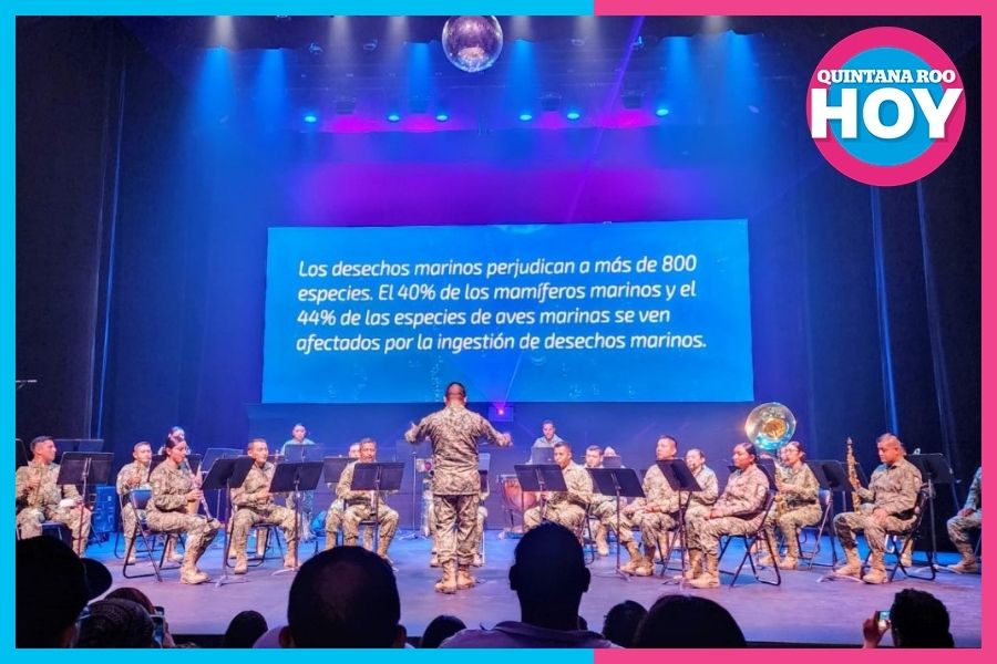 Cancún.- Entre datos duros para generar conciencia del cuidado de los océanos, la Banda de Música de la Décima Región Militar de la Secretaría de la Defensa Nacional, dirigida por el teniente Músico Carlos Albino Villanueva García, ofreció un gran un concierto por el océano con el que pusieron a cantar y bailar a los cientos de asistentes que se dieron cita en el Teatro de la Ciudad.