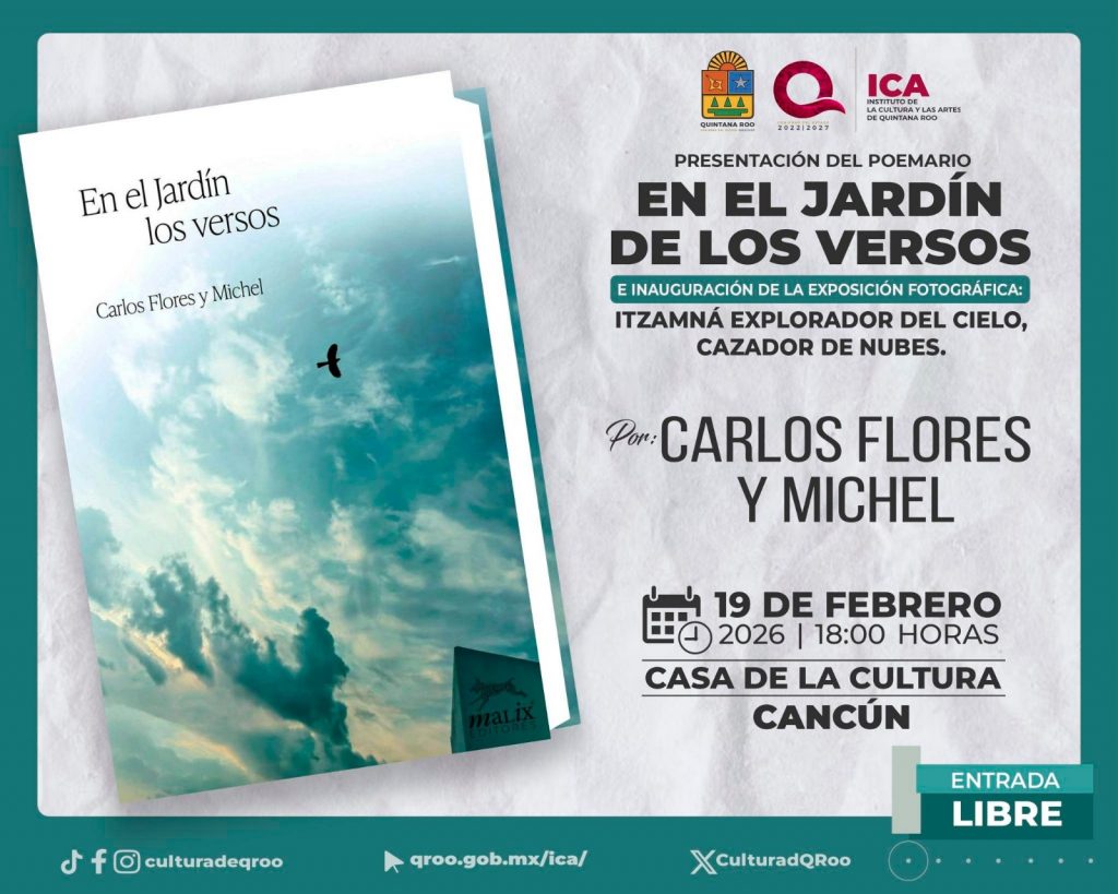 La cita es este 19 de febrero a las 6:00 p.m. en la Casa de la Cultura Cancún, donde Carlos Flores y Michel presentarán el poemario En el Jardín los versos y la exposición fotográfica Itzamná. Explorador del cielo, cazador de nubes.