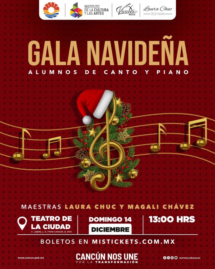 Cancún.- El encanto navideño llega al escenario con una presentación que promete envolver al público en emociones y melodías para celebrar la época más entrañable del año. La Gala Navideña de Alumnos de Canto y Piano reunirá a estudiantes guiados por las maestras Laura Chuc y Magali Chávez, quienes han preparado un programa especialmente diseñado para compartir sensibilidad artística y alegría musical.