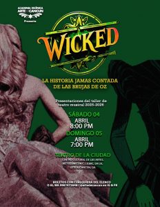 El próximo domingo 22 de marzo, el Teatro de la Ciudad de Cancún se teñirá de verde esmeralda con la presentación del musical Wicked, montado por los alumnos del taller de teatro musical 2025-2026 de Arte de Cancún, Grupo 2.