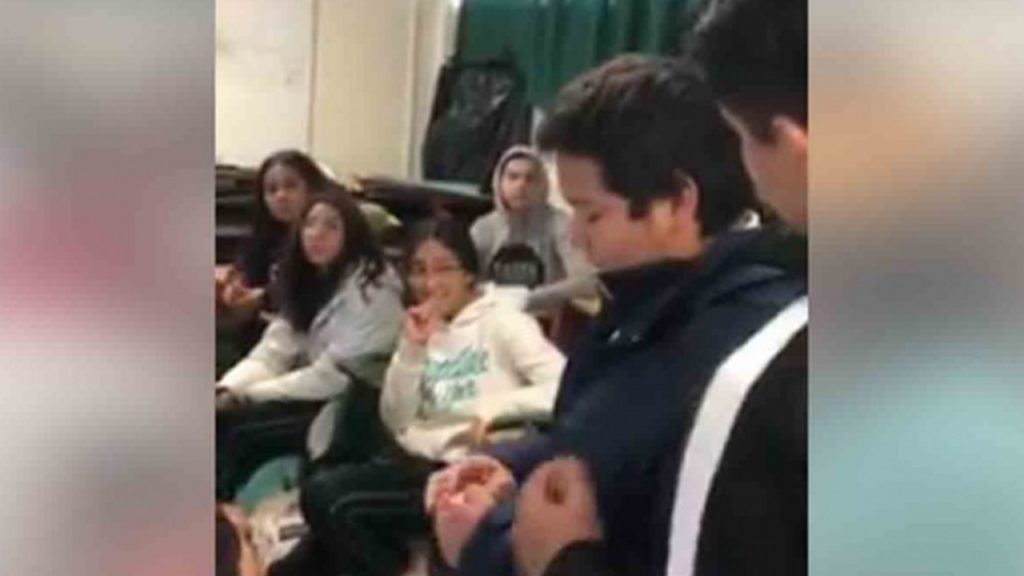 Los demás chicos de la clase lo alientan a que abra la caja.