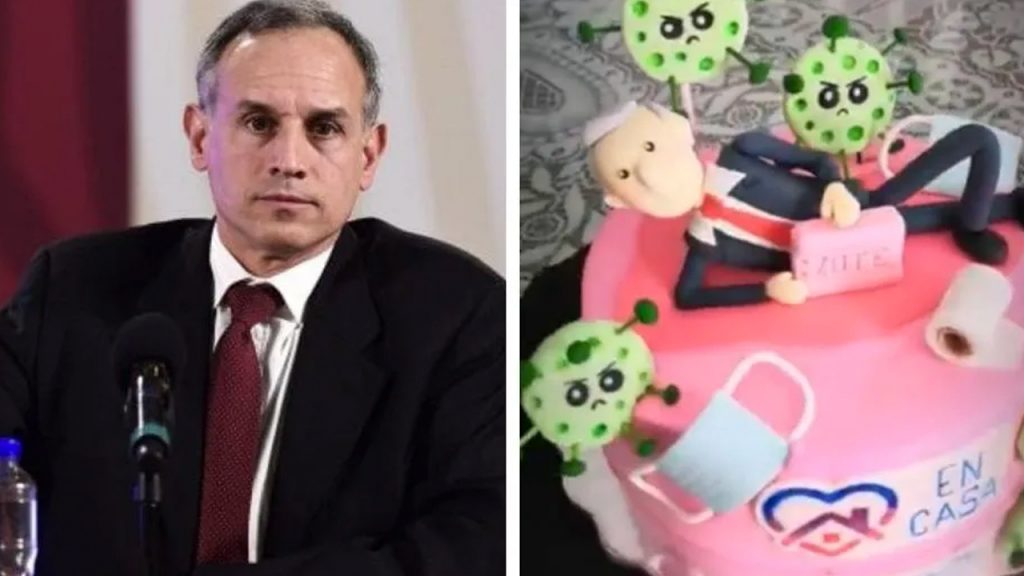 Se trata de un pastel donde el subsecretario posa felizmente en la parte superior junto a otros dos personajes que también se han vuelto famosos durante la pandemia, el rollo de papel higiénico y un jabón Zote.