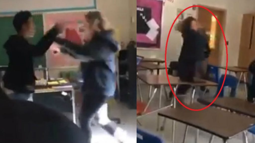Un alumno y una maestra de una preparatoria en Estados Unidos pelearon dentro de un salón de clases después de una discusión.