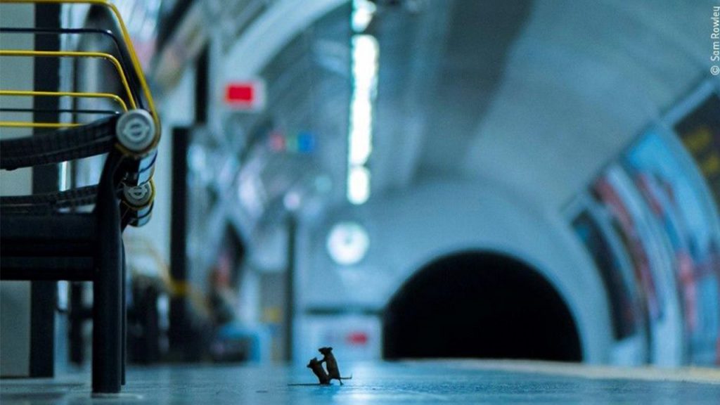 Rowley pasó varias noches tumbado boca abajo sobre los andenes de la línea central hasta que consiguió inmortalizar el momento en el que los pequeños roedores, habituales del subterráneo londinense, comenzaron su pelea por una miga de pan.