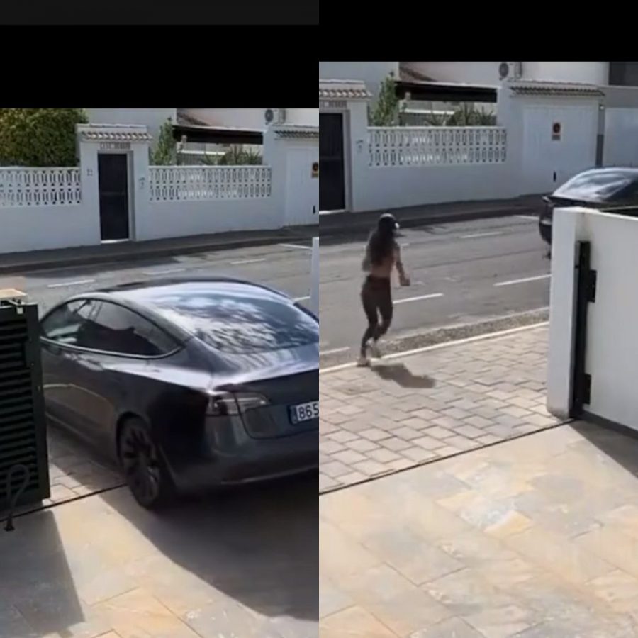 El auto comenzó en un principio a acomodarse para estacionarse, pero después decidió marcharse, por lo que la dueña salió corriendo de su domicilio en busca de su lujoso Tesla.