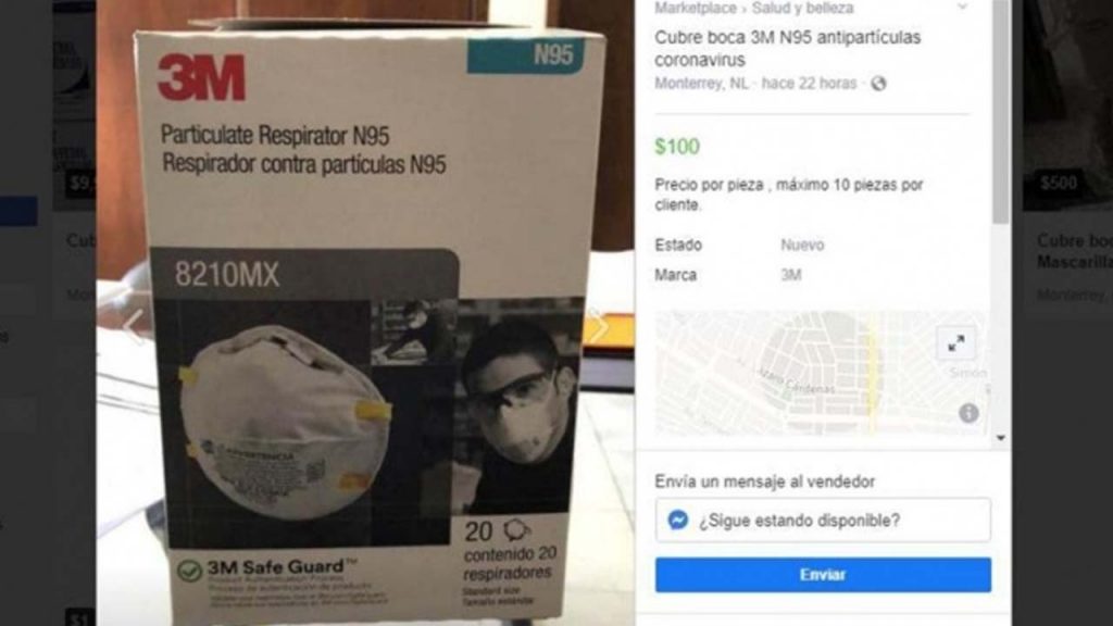 “Cubre boca 3M N95 antipartículas coronavirus”, se lee en una publicación que se hizo hace 22 horas, el vendedor especifica que tienen un precio de 100 pesos cada pieza y como máximo venderá 10 a cada cliente.
