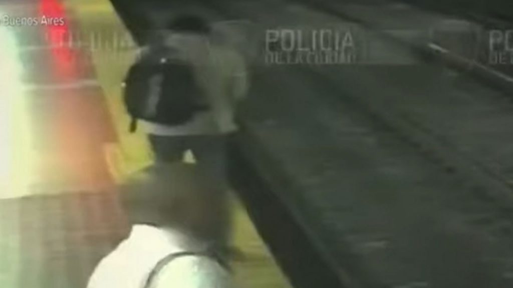 El hombre caminaba distraído por el andén de una parada de metro en Buenos Aires y no se da cuenta de que se acerca peligrosamente a la vía.
