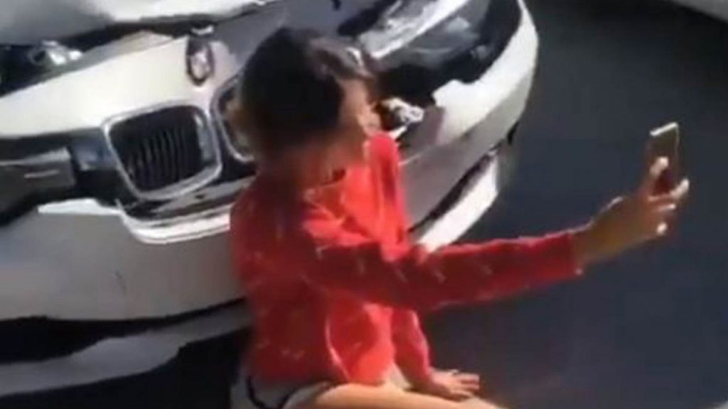 Una chica que había sufrido un fuerte accidente de tránsito decidió tomarse una selfie frente a su coche destruido.