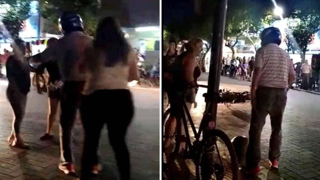 La acompañante del hombre intenta meterse en la discusión, pero la hija comienza a jalonearla del pelo. Mientras esto ocurre varias personas graban todo.