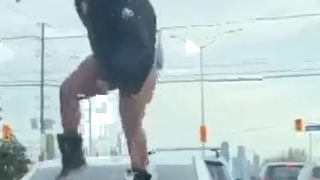 A medida que se acercan al automóvil, se puede ver a la mujer de pie en la parte superior del vehículo y gritando a toda velocidad.