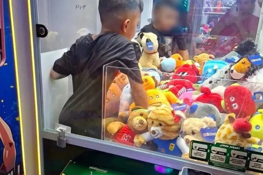 El menor, identificado como Dorlan Alexander, logró ingresar por el espacio por donde normalmente se entregan los premios, quedando dentro de la máquina rodeado de peluches.