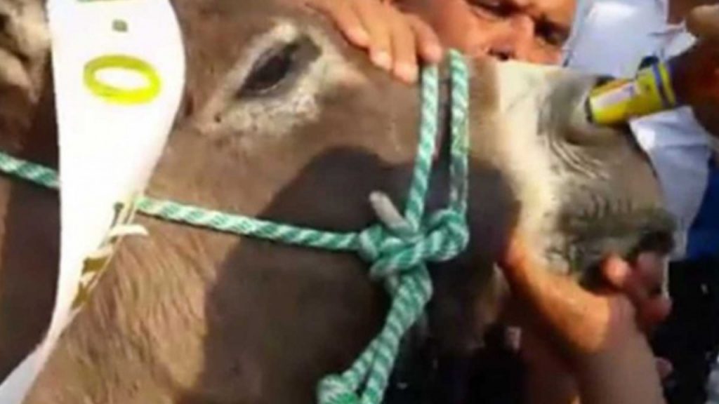 Y es que a través de un video que circula en redes sociales puede verse cuando una mujer obliga a un burro a tomar cerveza por la nariz después de haber ganado una tradicional carrera que se celebró en el municipio de El Colegio.