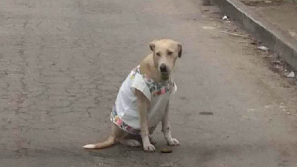 La perrita y sus hermanos son cubiertos con este tipico traje por las bajas temperaturas de la zona, polita es una perrita juguetona y cariñosa.