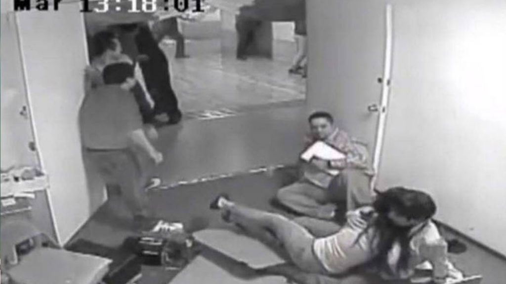 Las imágenes fueron captadas por el sistema de vigilancia y muestran a las personas intentando salir de una oficina, pero debido al movimiento caen al piso.