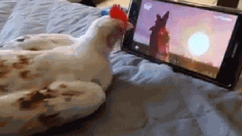 (Video) Gallo se viraliza por ver dibujos animados en un celular