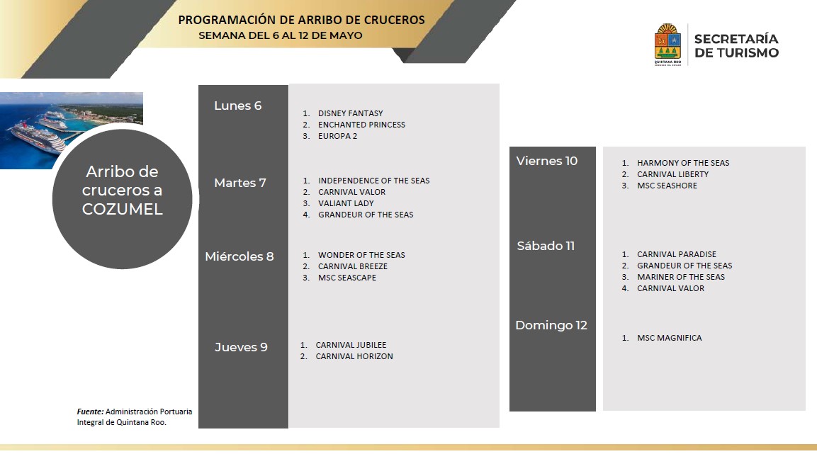 Cabe mencionar, que tan sólo la isla de Cozumel cerró el 2023 oficialmente con 4 millones 089,054 pasajeros de crucero, a bordo de 1,156 barcos, superando en 38.9% lo captado en 2022, pero aún por debajo de su máximo nivel alcanzado en 2019 que fue de 4.5 millones de viajeros en este segmento.