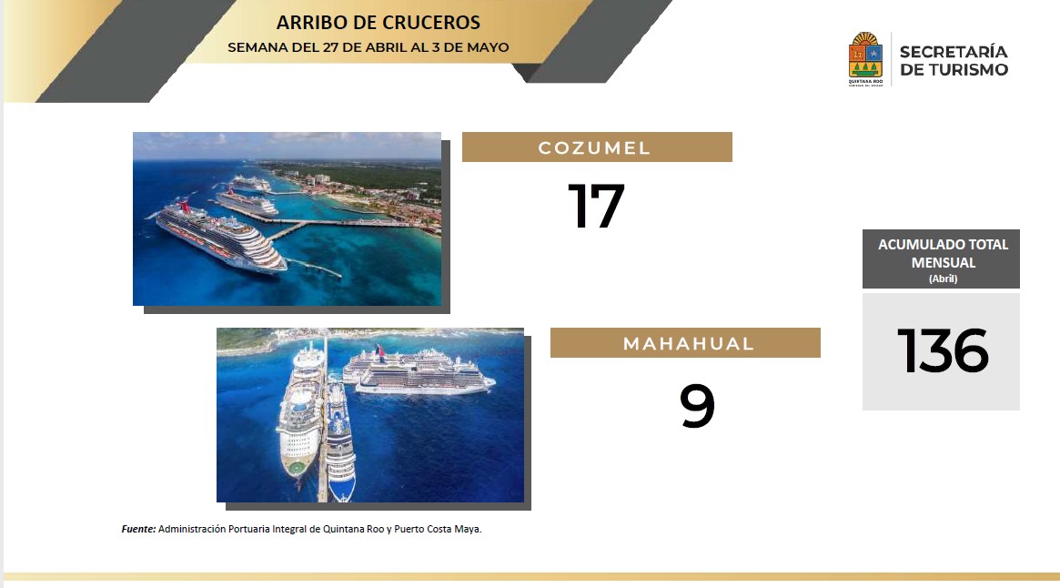 Cabe mencionar, que tan sólo la isla de Cozumel cerró el 2023 oficialmente con 4 millones 089,054 pasajeros de crucero, a bordo de 1,156 barcos, superando en 38.9% lo captado en 2022, pero aún por debajo de su máximo nivel alcanzado en 2019 que fue de 4.5 millones de viajeros en este segmento.