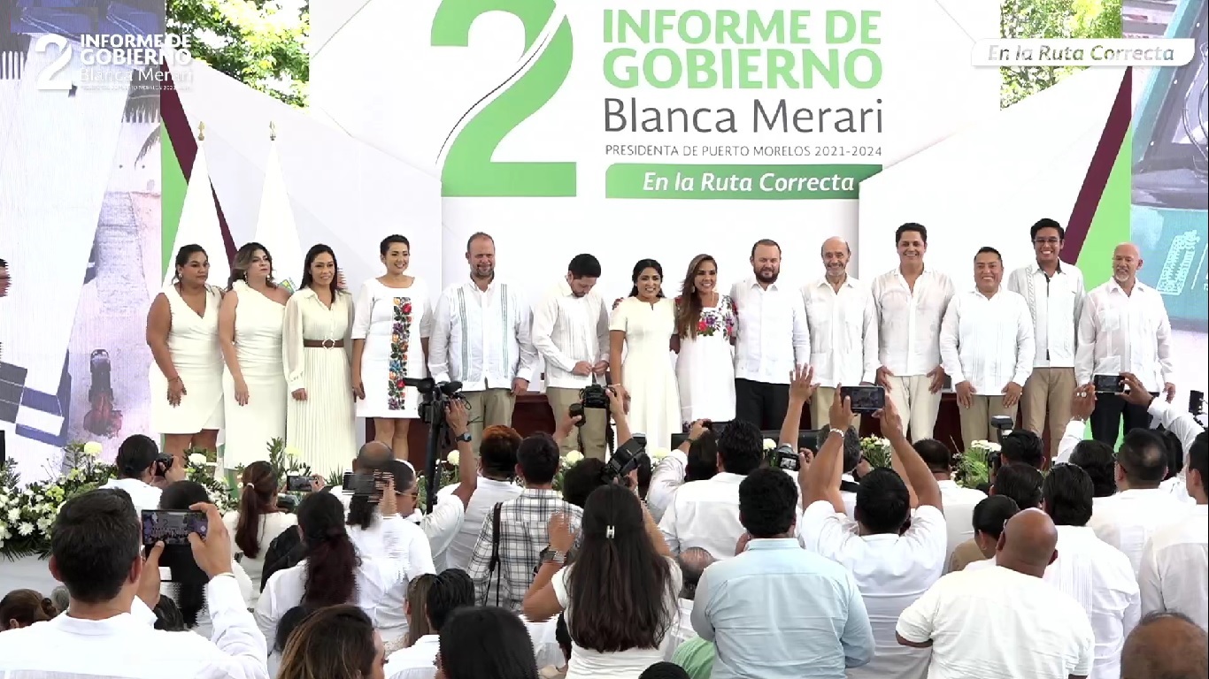 Puerto Morelos.- La presidente municipal de Puerto Morelos, Blanca Merari Tziu Muñoz, agradeció todo el apoyo recibido por parte de la gobernadora Mara Lezama Espinosa y la felicitó en nombre del pueblo por su Primer Informe de Gobierno, “su presencia nos fortalece” dijo en el marco del Segundo Informe de Gobierno Municipal.