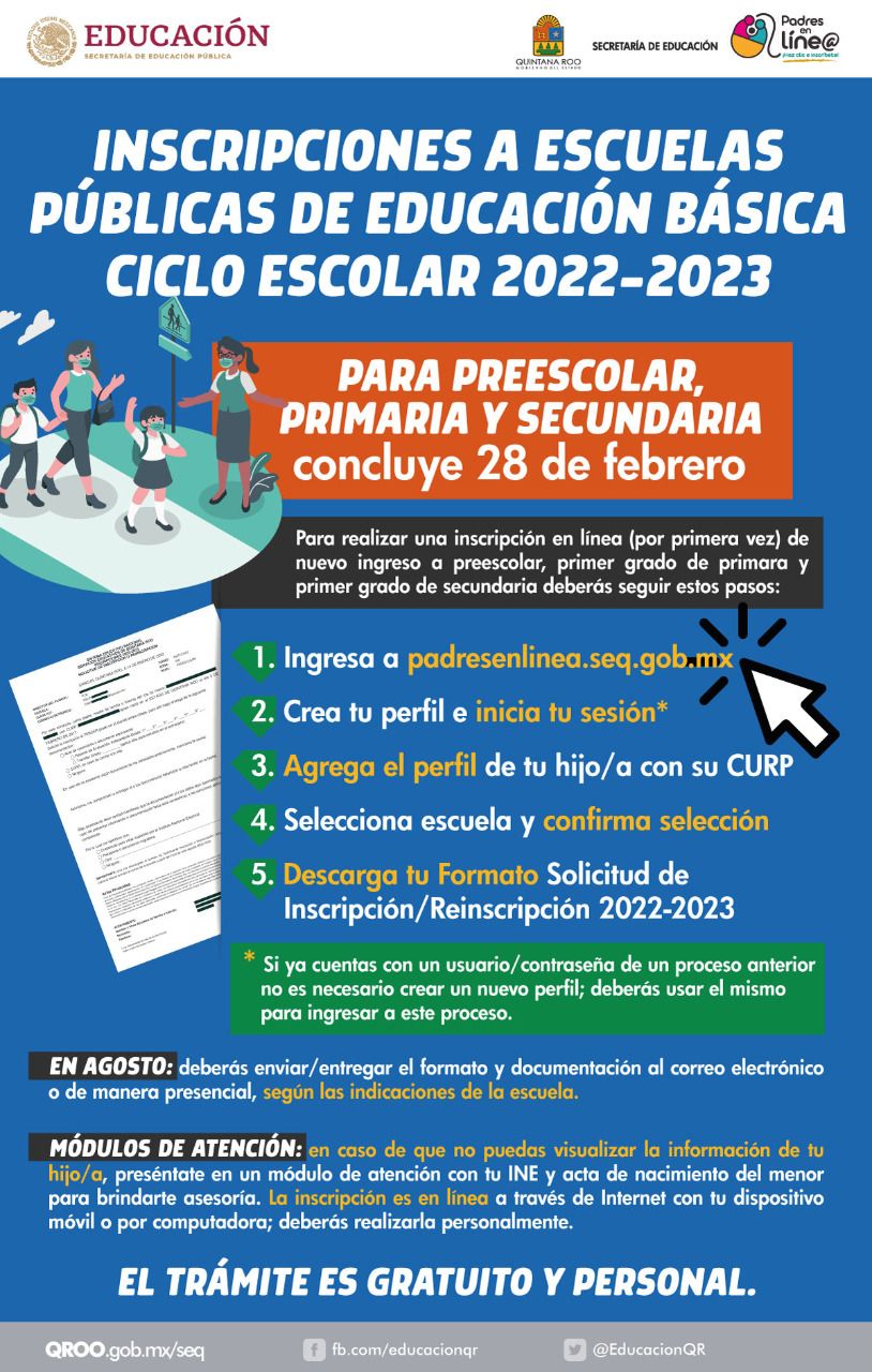 CHETUMAL .- Las inscripciones de nuevo ingreso y cambios a escuelas públicas para el ciclo escolar 2022-2023 en el nivel preescolar, iniciaron el 14 de enero y para primer grado de primaria y primer grado de secundaria el 01 de febrero. A la fecha se han registrado 62,273 alumnos: 11,118 en los tres grados de preescolar, 23,976 en primer grado de primaria y 27,179 en primer grado de secundaria.