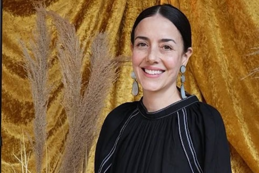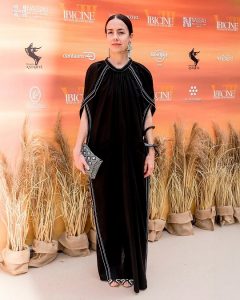 En la alfombra roja de Ibicine, Cecilia robó miradas con un look sofisticado y lleno de significado. Apostó por un vestido negro de silueta suelta, cuello alto y mangas tres cuartos, cuyo diseño envolvente y asimétrico resaltó por su elegancia y originalidad. La prenda, confeccionada en manta mexicana, fue embellecida con un fino pespunteado blanco en mangas y laterales, creando un contraste visual de gran estilo.