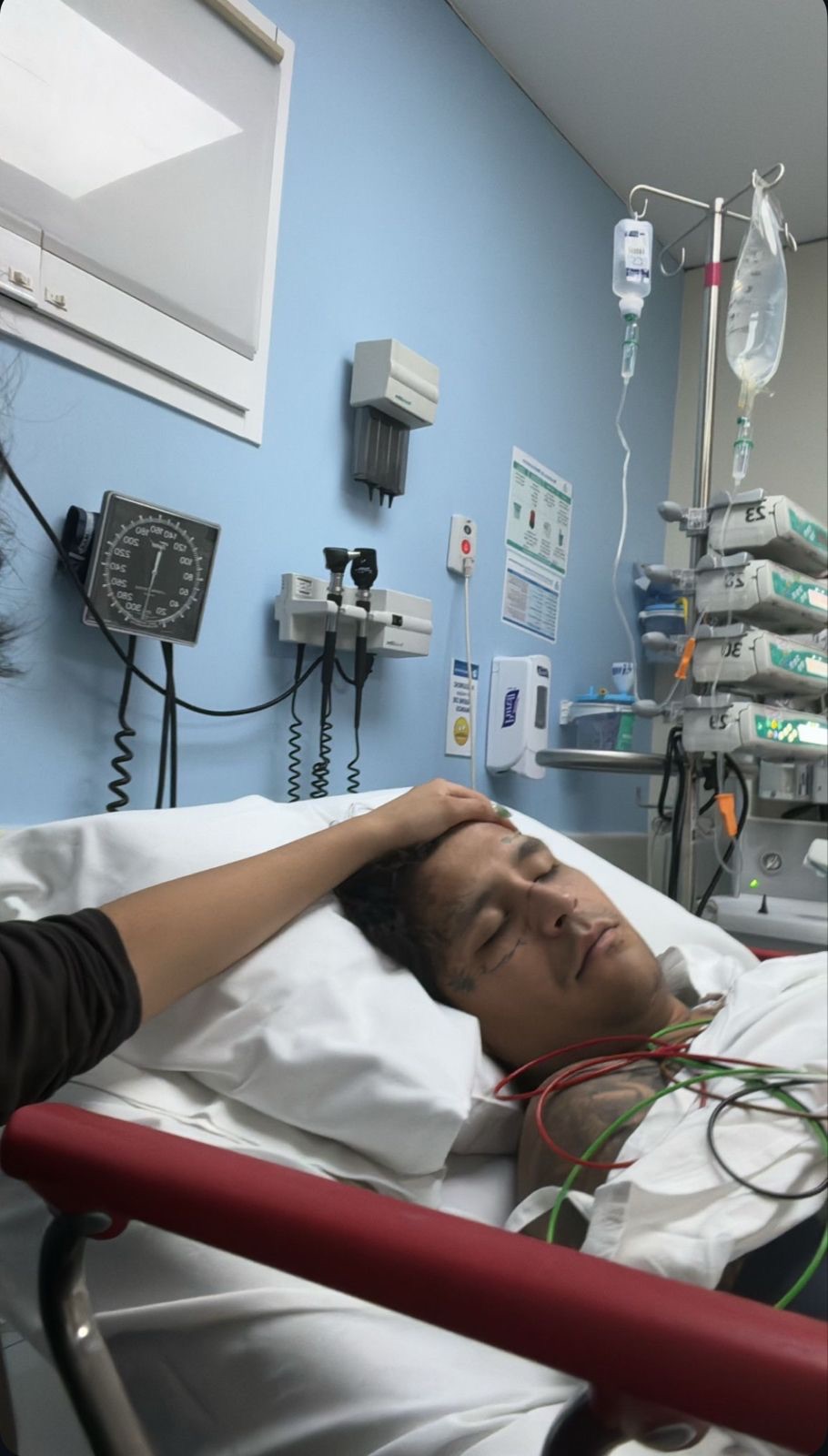 Posteriormente el cantante publicó una fotografía donde se le puede ver en una camilla de Hospital. Se puede ver a una persona junto a él, pero aún se desconoce si se trata de su esposa, Angela Aguilar.