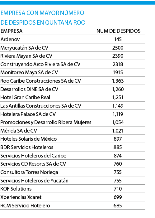 Un informe oficial del gobierno de México sobre la pérdida de empleos formales ante el Covid 19, revela que en Quintana Roo, las empresas afiliadas al IMSS han despedido a más de 63 mil trabajadores, que además de sus ingresos, han perdido los servicios de salud para ellos y sus familias, acceso a incapacidades, derecho a pensiones por fallecimiento y cuidado de sus hijos en guarderías.