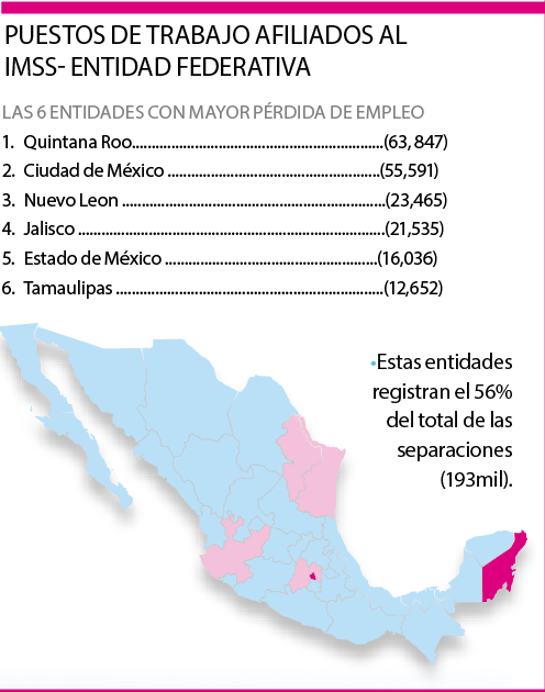 Las seis entidades con la mayor pérdida de empleo son Quintana Roo, Ciudad de México, Nuevo León, Jalisco, Estado de México y Tamaulipas, entidades que “registran el 56% del total de las separaciones de los trabajadores al Instituto Mexicano del Seguro Social (IMSS).