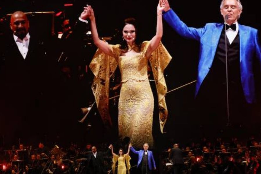 Desde Italia, el tenor Andrea Bocelli encabezó el espectáculo como parte de su gira Romanza 30th Anniversary World Tour, acompañado por Los Ángeles Azules y Ximena Sariñana, en un cruce musical que unió generaciones y estilos.