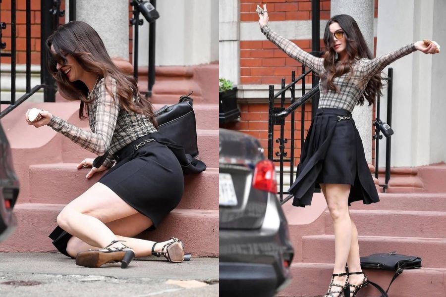 Vestida como su personaje Andy Sachs, con una falda plisada negra, una blusa semitransparente a cuadros y tacones de tiras, la actriz reaccionó de inmediato, levantándose con una sonrisa, alzó los brazos en un gesto que imitaba una postura gimnástica y tranquilizó a quienes presenciaron el incidente con un enérgico “¡Estoy bien!”.