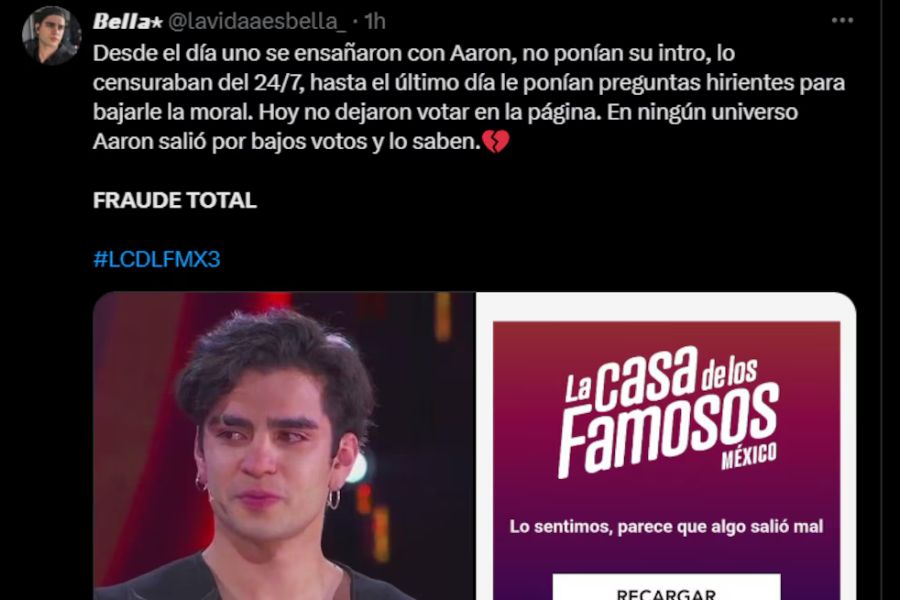 “Suerte lomecanitas! Me retiro del programa pero espero no le roben el triunfo a Aldo. FRAUDE TOTAL. Aarón nos vamos contigo @ViX”.