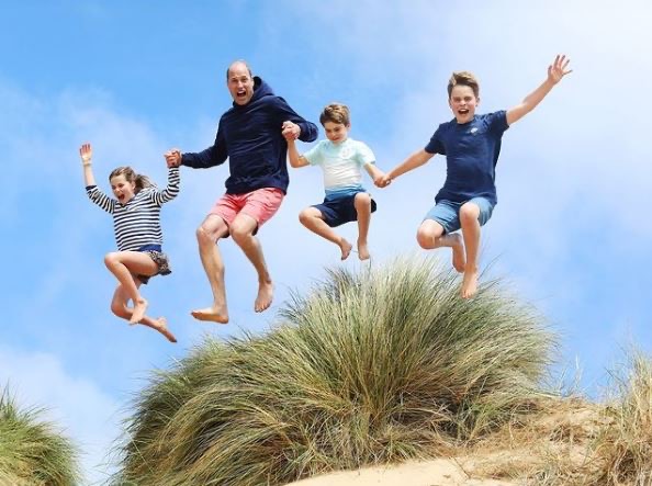 En la imagen publicada este viernes, se puede ver que los cuatro se toman de la mano, saltando sobre una duna de arena en la playa, con los brazos en el aire y la boca abierta.
