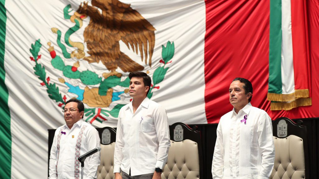 El gobernador Carlos Joaquín y los representantes de los poderes Legislativo y Judicial entregaron la Medalla al Mérito Distinguida Quintanarroense María Cristina Sangri Aguilar a Brisa Blanca Leticia Galván Villalpando por su aportación a la educación media profesional inclusiva, en sesión solemne del Congreso del Estado.