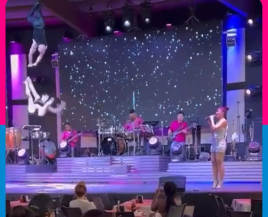 Durante una interpretación musical, un par de acróbatas tuvieron un problema en la realización de una acrobacia, por lo que la bailarina cayó al suelo desde las alturas. Al caer, la bailarina no fue auxiliada por nadie más que por su compañero que seguía suspendido en el aire.
